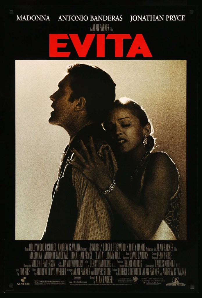 O filme lançado em 1996 apresenta um formato de musical, que explora desde a juventude da protagonista – interpretada pela cantora Madonna – até o auge do envolvimento da jovem com movimentos políticos devido a seu relacionamento com o até então coronel Juan Perón (Jonathan Pryce), futuro presidente do país.
