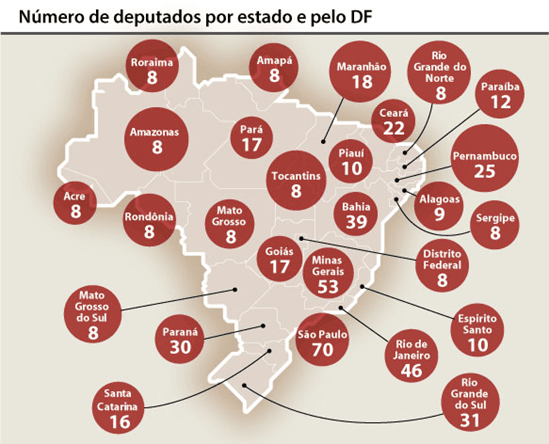 Olhando para o outro lado da moeda, está a Câmara dos Deputados. Muitas vezes confundia com as atribuições do Senado Federal, as competências privativas da Câmara são poucas: o artigo 51 (https://www.planalto.gov.br/ccivil_03/constituicao/Constituicao.htm#art51) da Constituição traz apenas cinco incisos e dois deles se referem à autonomia da Câmara em elaborar seu regimento e em se organizar. Desse modo, as principais competências da Câmara são: cobrar as contas do Executivo Federal quando não apresentadas ao Congresso no prazo de 60 dias depois da abertura da sessão legislativa e autorizar abertura de processo por crime de responsabilidade (o impeachment). Os 513 integrantes da Câmara dos Deputados são eleitos a cada quatro anos. As vagas são divididas por Estados e pelo Distrito Federal e definidas por lei complementar. A atual divisão entre os Estados pode ser visto na imagem abaixo: