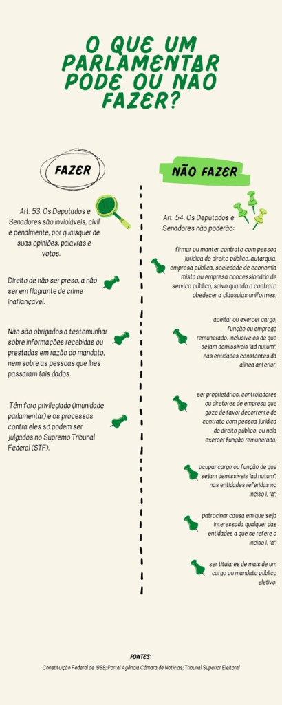 Os parlamentares legislativos, tanto do Senado quanto da Câmara tem certas prerrogativas e certos limites constitucionais, conforme o infográfico: