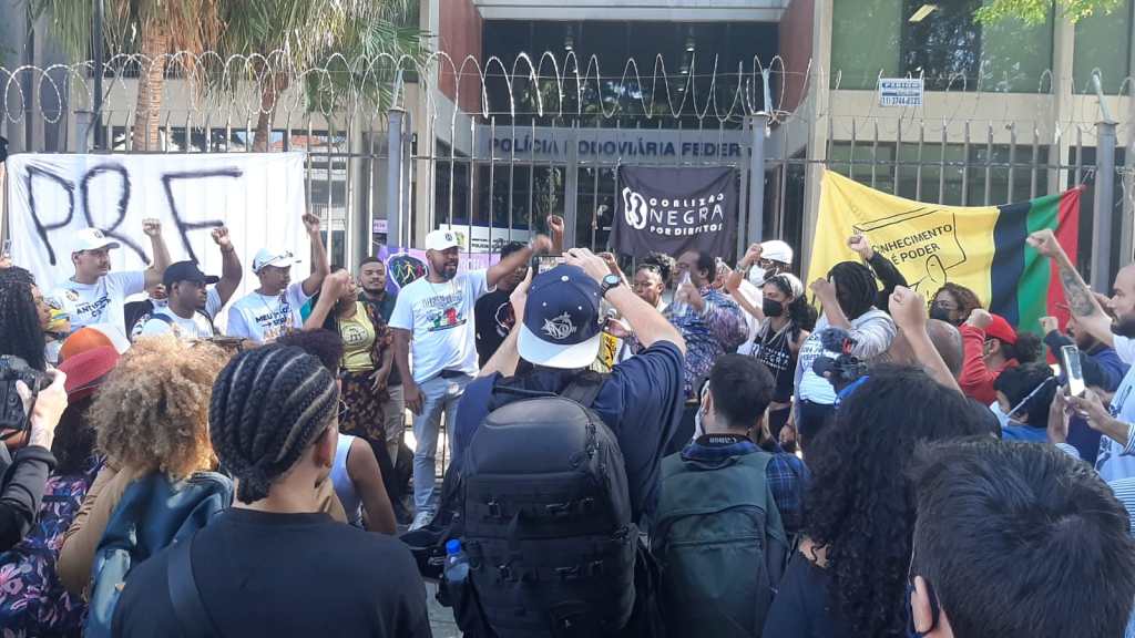 Integrantes do movimento negro ocuparam a frente da sede Superintendência da Polícia Rodiviária Federal (PRF), na zona norte da cidade de São Paulo, na manhã desta sexta-feira (27) em protesto contra mortes provocadas por agentes da corporação.