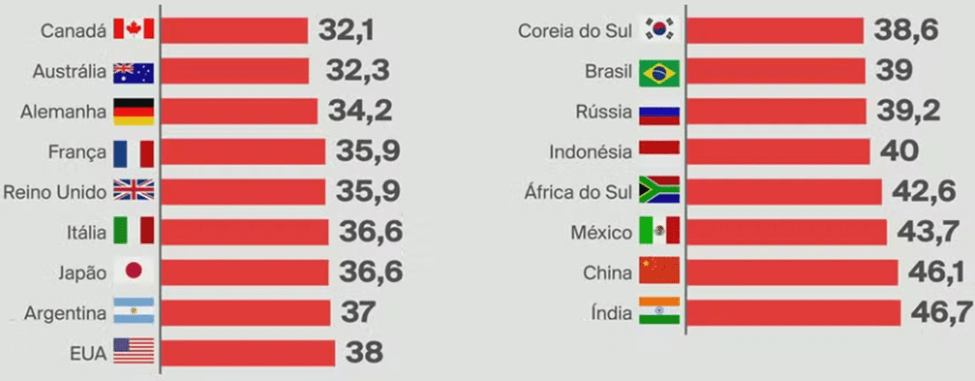 O gráfico evidencia a média de horas trabalhadas entre os cidadãos dos países integrantes do G20, destacando o Brasil na 7ª posição. Observa-se que a carga horária média brasileira permanece inferior apenas à de algumas nações consideradas emergentes pelo Norte Global, tais como Índia, México, África do Sul, Indonésia, Rússia e China.