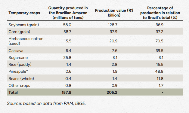 O gráfico evidencia a relevância econômica da produção agrícola na Amazônia brasileira que concentra elevados volumes e valor econômico, revelando a forte inserção da região no modelo agroexportador. Ao mesmo tempo, o gráfico apresenta o potencial de diversificação da cultura produzida na região, que se alinha a um modelo produtivo ligado à sociobiodiversidade, como a mandioca, arroz e abacaxi, indicando a importância de sistemas produtivos voltados às economias locais e à segurança alimentar.