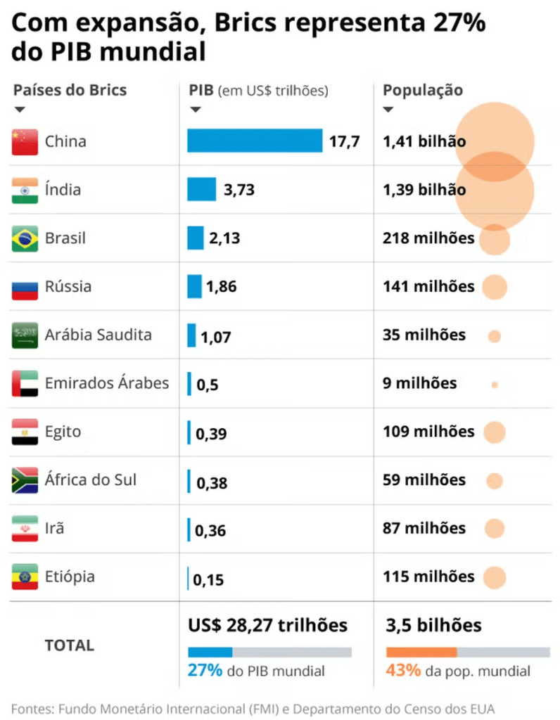 O gráfico acima apresenta o peso econômico e demográfico do BRICS+ após sua expansão, destacando a participação conjunta do bloco no Produto Interno Bruto mundial e na população global. Segundo os dados, o BRICS ampliado passa a concentrar aproximadamente 27% do PIB mundial, o equivalente a US$ 28,27 trilhões, e cerca de 43% da população global, totalizando 3,5 bilhões de pessoas.